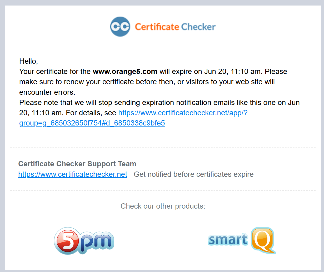 That's where Certificate Checker comes in. It keeps an eye on the certificate expiration date and sends a heads-up a week in advance, so you can resolve issues before they cause trouble and issue an updated certificate in time. Thus, you can avoid the consequences of things like missed manual renewals, forgotten certificates, or broken configurations that break the automatic renewal process.
